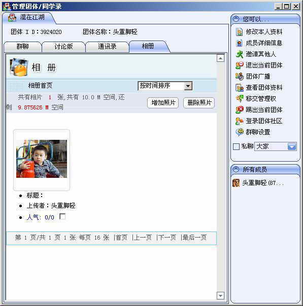 UC的群任何用户都能建立,而且其管理也远比QQ2004方便,群的管理权限还可以移交给其他用户,不至于使群和用户共存亡。UC3.8这次把讨论版、相册、通讯录等功能也嵌入到了群聊面板当中(图4),而不是像腾讯那样需要通过浏览器才能访问相似的内容。