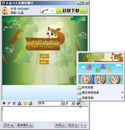 在聊天窗口中,选择场景按钮,即可选择“松鼠大战”、“石头剪子布”、“涂鸦画笔”等众多的游戏(图5)。