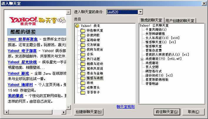 在Yahoo Messenger的窗口中点击“聊天”按钮,会弹出如图6所示的窗口,你可选择进入某个聊天室,也可以自己创建一个聊天室。