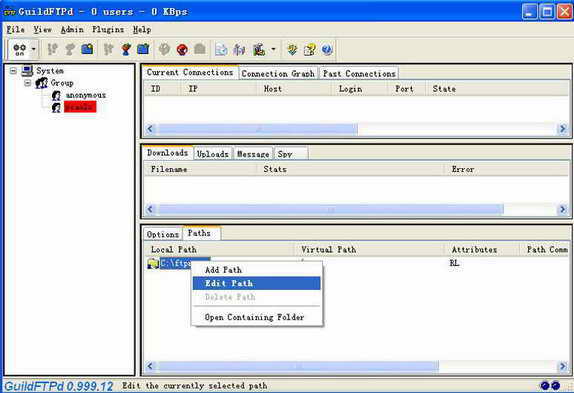 建立了FTP服务端用户后,选择主界面中的一个用户,在“Paths”标签中指定默认的C:\ftproot目录,在弹出菜单中选择“Edit Path”(图1),这时会弹出“GuildFTPd:Add/Edit path”对话框,可以在“Attributes”项目中自定义权限属性。默认设置下支持“Read(可读)”及“List(列表)”,其中“Write”表示可写;“Create”表示可创建文件夹/文件。