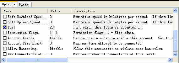 我们在GuildFTPd程序中选择某个用户后,查看界面右下端的“Options”标签页,找到其中“Name”标志为“Port”的选项,大家可以看到连接端口默认值为21,双击对应的“Value”参数,就能在可输入文本框中自定义端口号了。然后“Port”复选框将被自动选中,使设置生效(图2)。GuildFTPd的“绝招”就在于可以按此方法对添加的所有用户定制不同的连接端口。