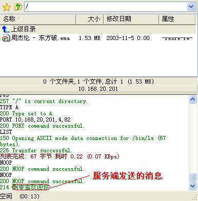 大家在界面上端的“Current Connecti ons”标签页中,可以看到当前连接到FTP服务器的客户机。如果你想给对方发送一条消息,可按以下方法操作。首先,选择指定客户端的主机IP后,在右键弹出菜单中选择“Send message to user”(发送消息给用户)。然后,在弹出对话框中输入消息内容后,点击“Send”按钮即可。此后,该访问者在他的FTP客户端程序中就可看到此条消息了(图3)。