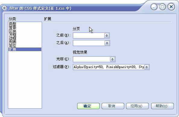 打开Dreamweaver MX 2004的CSS设计器,新建一个名为fiter的样式,在弹出的对话框中选择扩展类型,对各属性进行填写。选择过滤器下拉选项的第一项Alpha,表达式如下填写 :alpha(opacity=?,finish opacity=?,style=?,startX=?,startY=?,fin ishX=?,finishY=?)。其中“?”部分根据实际所需效果填入阿拉伯数字(图1)。