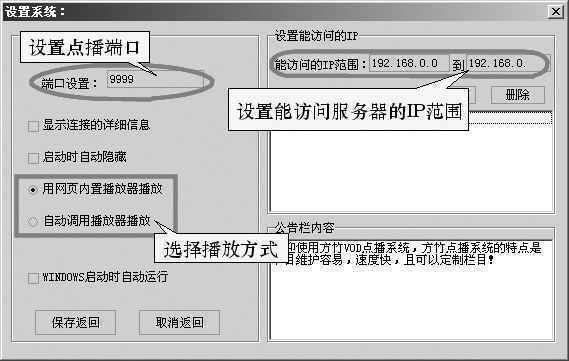 在服务器上安装方竹点播系统,安装好后只有一个文件(短小精干,果冻喜欢),并且程序在桌面上会创建一个快捷方式。第一次运行软件,在主界面上点击“设置”按钮,进入“设置”对话框。结合局域网用户的实际需求,在该对话框中对端口、播放方式和可访问服务器的IP地址范围等分别进行设定(图1)。