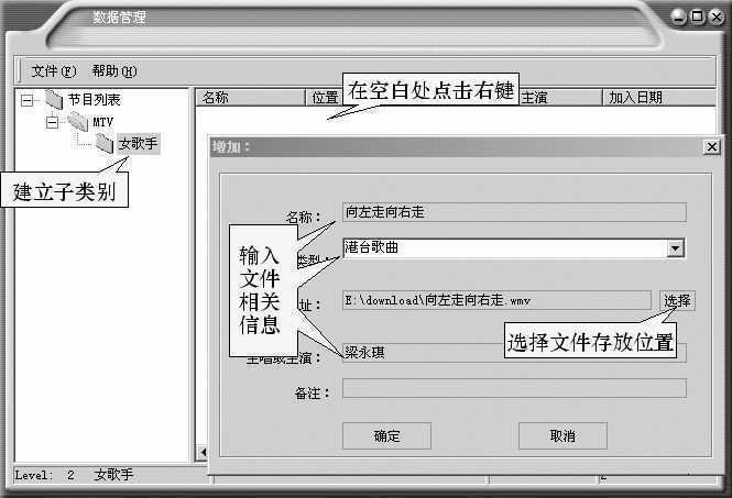 接下来点击“节目管理”按钮,进入“数据管理”对话框。这是一个类似于Windows资源管理器界面的窗口,窗口左侧为节目的分类树形目录,而在右侧窗口中则可以显示具体的节目。由于是第一次启动该软件,其中并没有任何节目,需要用户自己添加。右键点击“节目列表”,选择“增加”,输入第一级子类别名称MTV后,在MTV下再增加第二级子类别(如男歌手、女歌手),然后便可以往二级类别中添加MTV歌曲了。在右侧窗口中点击右键,选择“增加”,将会弹出一个对话框,在其中输入MTV的歌名、歌手名,并确定该歌曲所在的位置后,点击“确定”按钮即可(图2)。