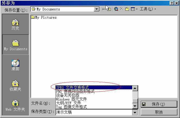 由于数码相机一般都具有播放相片的功能,而且大部分的产品内置TV out(视频输出)接口,因此我们只要动动脑筋,就可以把它变身成一部幻灯机,用来代替笔记本电脑和PowerPoint幻灯片软件,轻轻松松完成各种户外的演示工作。这种做法非常简单,我们只须将PowerPoint制作的幻灯文件转换成JPEG格式,再输入到数码相机中就行了。