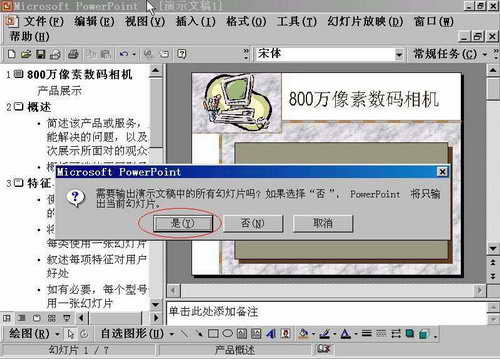 3.然后程序出现提示画面询问“需要输出演示文稿中的所有幻灯片吗?”,用鼠标点“是”,就可把PowerPoint的各页幻灯片全都转换成JPEG图片(图2)。
