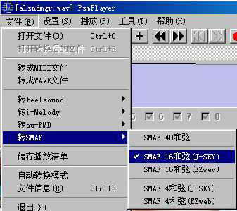 你想把自己或别人的声音作为铃声吗?先用Windows自带的“录音机”录下一句想作铃声的话,保存为WAV文件。然后用Psmplayer打开录好的WAV文件,先用Psmplayer试听一下,也可以对它进行一些调整,如增减音量、调节播放速度、剪切等。满意后点击“文件→转换为SMAF格式→SMAF16和弦(J-SKY)”(如图),在弹出的对话框内的限制大小处填上16000,T108支持的最大铃声文件是16KB。然后再用Psmplayer打开MMF文件,可以试听一下,觉得满意后就让它等待效命了。