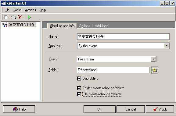 启动xStarter,它会将图标添加到系统托盘区,右键点击该图标,选择“Main”即弹出软件的主界面。在工具栏点击“New Task”按钮(图1),在“Name”栏输入任务的名称,然后通过“Run task”右侧下拉菜单选择“By the event”,并给该任务设定具体的触发事件“File system”,激活文件监控功能。