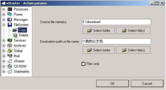 接下来,切换到“Actions”页面,点击“New action…”按钮,弹出“xStarter-Action params”对话框(图2),依次打开“FileSystem→Copy”节点,然后分别通过“Source file names”和“Destination path or file name”选择源文件夹和闪存目标文件夹,点击“OK”保存设置。