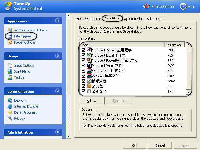 打开“TuneUp SystemControl”(系统控制),点击“Appearance”(外观)项目下的“File Types”(文件类型),再在右侧栏中选择“New Menu”(新建菜单)选项卡。在这里去掉你不需要的新建文件类型前的钩就可以让它不在“新建”菜单中显示,如果以后又需要用到,则只要再勾选上就可以了(图2)。