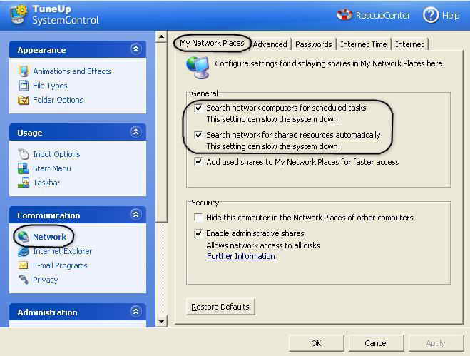 打开“TuneUp SystemControl”,点击“Network”(网络),再在右侧栏中选择“My Network Places”(我的网络)选项卡。在这里去掉“General”(一般)中的前两个勾选项即可(图3)。