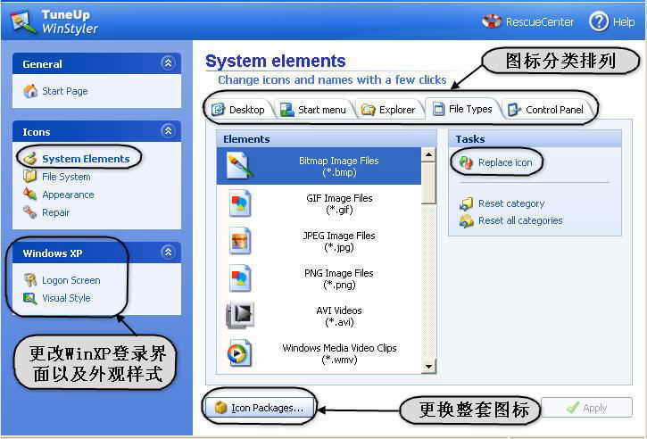 提示:TuneUp Utilities 2004支持Style XP的各种图标包、登录界面和外观样式,大家可以到Style XP的官方网站(http://www.themexp.org )去下载,然后直接导入。