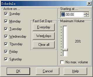 单击“Add”,打开“Schedule”对话框,单击“Everyday”选定一周的七天(或直接勾选星期),再将“Maximum Volume”滑块拖曳到20%,然后在“Starting at”中输入“22:00:00”,最后单击“OK”即可设置完成(图1)。