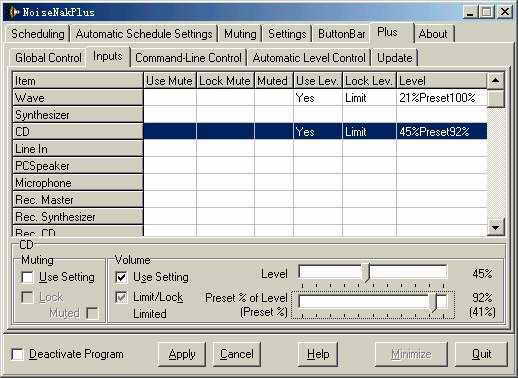 在具体使用时,也许你还会遇上这样一个问题:你想听CD,但恰好此时的音量被锁定在较低水平,而你又不愿因此而随意更改音量调节方案。其实软件还可以对不同的音频输入分别设置音量,例如你可专为听CD设置一个音量,它只在播放CD时有效,不会与日常的音量调节方案相冲突。