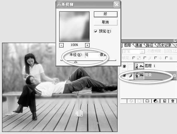 在图层面板中回到背景层,点菜单“滤镜→模糊→高斯模糊”。这里根据需要设置模糊大小(图3)。模糊后的图像要“像素膨胀”,与我们开始抠出的主体图像呈现明显的边缘。没关系,下面我们就要处理这生硬的边沿。这里有人会说其实没必要单独拷贝一层,在第一步的时候直接“羽化”,然后反选,最后“模糊”处理这样更简单。这正是我们不用“羽化”的原因,因为“羽化”的现象太多,大家太熟系,处理的效果也呆板。