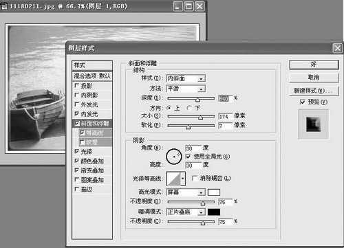 2.按键盘上“Ctrl+C”拷贝,接着再按“Ctrl+V”粘贴,继续点菜单“图层→图层样式→斜面和浮雕”,在弹出的图层样式设置面板中设置浮雕的参数。在图层样式中的功能非常的强大,可以设置很多艺术效果(图2),自己多试试吧!