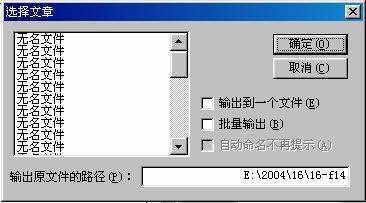 如果你在输出文档时没有选中任何文字块,这时就会弹出另一个文章选择的窗口(图2),该窗口有输出到一个文件和批量输出两个选项。选择输出到一个文件是将整个飞腾文件中的全部文字块按该窗口左边所列的文字块先后顺序,依次把文字块的文字连接输出到一个文本,并在每个文字块的文字间加上了一个换行符,所以在输出的文件中的文字顺序可能不是理想的顺序;选择批量输出是将整个文件中的每个文字块都分别输出一个文本文件。
