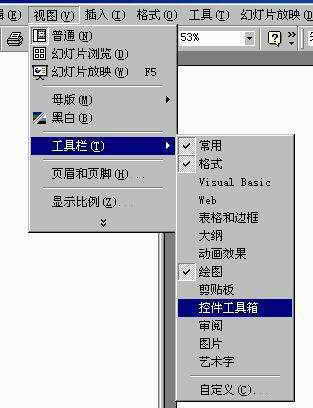 在Powerpoint中执行:“视图→工具栏→控件工具箱”,打开“控件工具箱”面板(图1)。点击“控件工具箱”面板中的“其他控件”按钮,在出现的下拉列表中选择“Shockwave Flash Object”(图2)。
