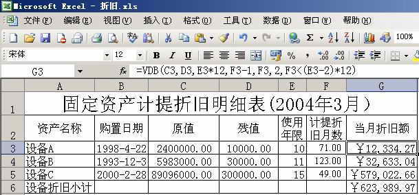 为了计算当月折旧额,只须在G3中输入公式“=VDB(C3,D3,E3*12,F3-1,F3,2,F3<(E3-2)*12)”。