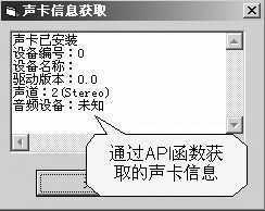 说明:该函数用于获取声卡的相关信息,包括设备编号、设备名称、驱动版本、声道和音频设备等。