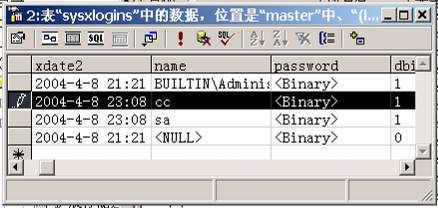 进入“企业管理器”,打开sysxlogins表(见图),在name列中找到“cc”并将它修改为“aacc”,保存并退出。