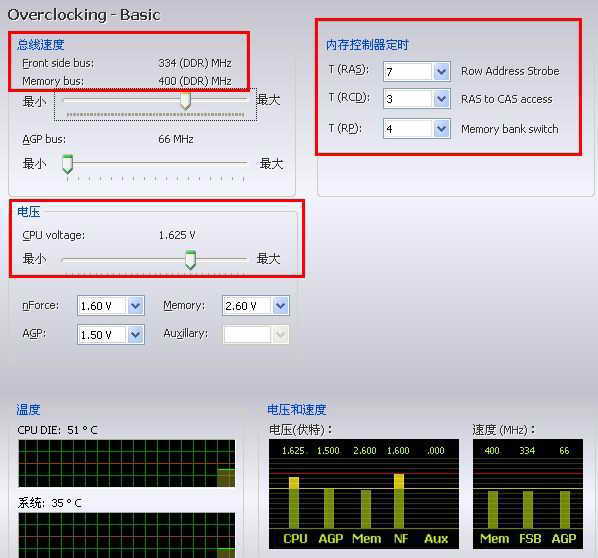 System Utility是 NVIDIA公司最近推出的一款NF2/NF3主板超频监控工具,可以在Windows界面下直接调整前端总线(FSB)频率、AGP频率、内存参数等。打开System Utility,调节速度滑块可以调整前端总线频率和AGP频率(见图),其中Front side bus和Memory Bus是一起变化的,这和BIOS中所调节的FSB/DRAM比率是一样的。