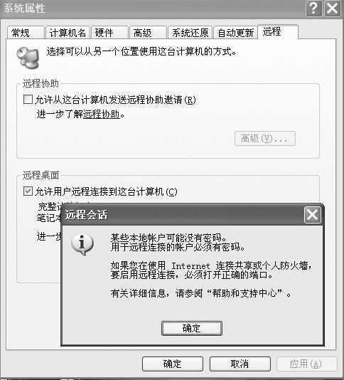 要想从Windows 2000远程访问Windows XP,首先必须激活Windows XP的“远程桌面”功能。在桌面上右击“我的电脑”图标,选择“属性”命令,打开“系统属性”窗口,切换到“远程”选项页,选中“允许用户远程连接到这台计算机”复选框,此时会提示某些本地账户可能没有密码,不管它,直接点击“确定”按钮即可(如图1所示)。