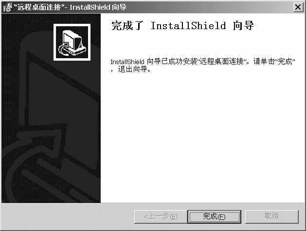 插入Windows XP安装光盘,当弹出欢迎画面时,选择“执行其他任务”,接着再在窗口中选择“设置远程桌面连接”任务,此时会弹出“远程桌面连接”向导对话框,直接点击“下一步”按钮,按照向导的提示不停点击“下一步”按钮,当看到图2对话框时,远程桌面客户端程序就安装成功了。