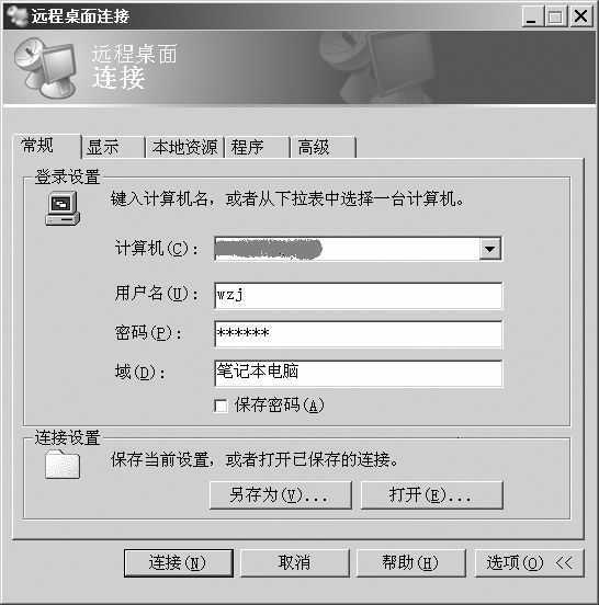如图3所示,键入Windows XP机的IP地址或者计算机名,如果是在局域网中使用,那么应该是内部IP地址,用户名和密码就是前面所添加的远程桌面用户名和密码,如果你觉得有必要,可以在“显示”页中设置远程桌面的分辨率、颜色;“本地资源”页可以设置远程桌面自动映像的本地计算机资源,例如将远程计算机声音带到访问的计算机、留在远程计算机、不播放等选项;在“程序”选项页可以设置连接成功后自动启动的程序文件;“高级”页可以根据网络实际情况选择连接速度,或者设置是否使用桌面背景、在拖拉时是否显示窗口内容等,最后点击“连接”按钮,如果一切顺利的话,很快就可以连接成功了。