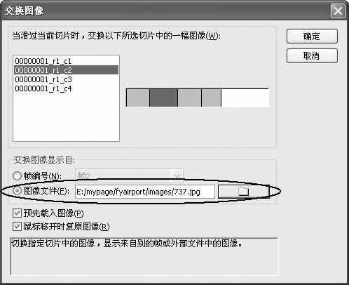 简单变换图像是在当前切片正下方的帧中进行交换,只涉及一个切片,可以应用在网页按钮上。首先选择切片,用鼠标拖动切片中央的行为手柄移动到此切片的任意位置,松开鼠标后会弹出“交换图像”的对话窗口,我们可以选择“帧2”(帧1就是切片本身),然后在帧面板中创建一个用于交换图像的“帧2”,也可以单击“交换图像”窗口中的“更多选项”按钮,选择一个“图像文件”用于交换(图2),完成设置后,按“F12”键来预览效果。