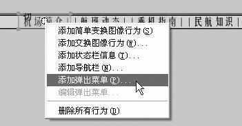 使用Fireworks切片也能制作出漂亮的弹出式菜单,首先在需要设置弹出菜单的地方创建切片,点击行为手柄,在弹出的菜单中选择“添加弹出菜单”(图3),打开“弹出菜单编辑器”,接下来经过简单的四步就会创建出弹出菜单。