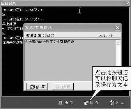 在Netcall中查看交谈纪录也非常方便,只要点击工具条中间的按钮,所有用户的交谈记录就都会显示出来(图2)。