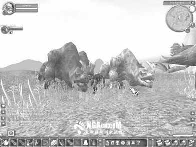 如果你习惯了各种网络游戏中那些各自为战、或者最多只是扎堆在一起的怪物,那么当你第一次看到莫高雷地区(牛头人起始区域)的科多兽群的时候,一定会感到无比的震撼。玩过《魔兽争霸Ⅲ》的人都知道,兽人在作战时喜欢让背着战鼓的科多兽随行以提高士气,其实这种巨兽是一种相当温驯的食草兽,也是牛头人的主要食物来源。在刚刚走出新手区赶往兽人首都雷霆崖的途中,我目睹了一头巨大的黑色母科多兽迈着沉重的脚步穿越草原,还有五六只个头稍小的浅灰色科多兽跟在它身后,似乎是在迁徙一般,那种场面和气势让我震惊得几乎忘了截图。最有趣的是在这群科多兽身后还跟着几个鬼鬼祟祟的兽人,他们看准了走在最后面的那一头科多兽,趁它跟队伍脱节的时候一拥而上去杀掉了它,然后继续跟着科多兽们前进,伺机捕猎下一头──这让我想起了非洲草原上到处可见的豺狗。