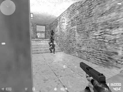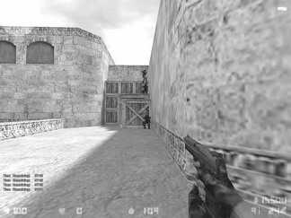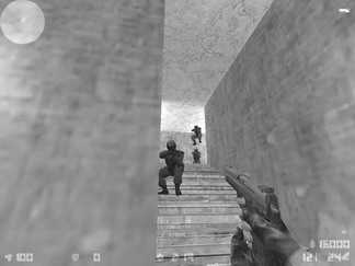 6.T可以在2楼的楼梯前面架枪(见图6),这个位置的好处是T的火力很集中,而且CT冲上来的时候头通常会往右侧看而忽略T防守的角度,缺点也很明显:CT可以在墙外穿透射击,所以记住站位的时候要稍稍往前面挪一些。
