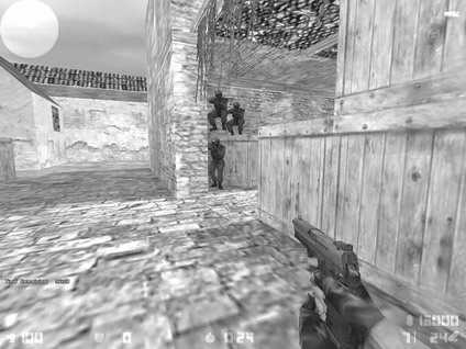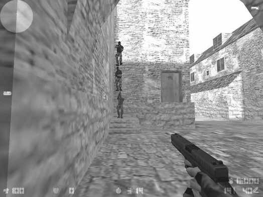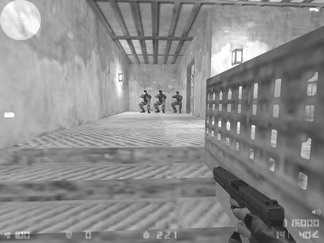 7.除此之外还可以在二楼的另一侧ECO,利用楼梯高度的落差搭建多人同一垂直线的架枪(见图7),这个位置相对而言还是略为理想的,原因是CT从这条路包抄的队员通常只有1名,如果能成功击毙他的话抢下武器冲杀过去,说不定就有翻盘的希望。