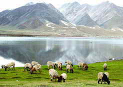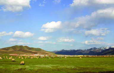 在兰州看了仰慕已久的黄河母亲雕塑,吃过正宗的兰州拉面。我们于5月3日清晨前往甘南藏族自治州夏河县,近5小时的车程。沿途那些瘦骨嶙峋的山脉上积雪未化,白一块黑一块,像是借了奶牛的花衣来穿。一路阳光灿烂,风光大好。下午,我们到达桑科草原,开始了真正的甘南之旅。虫虫终于见到了梦想中的大草原,虽然这里还是天寒地冻,草未青花未红,仍然非常壮美。特别是在路边看到一个巨大的冰湖,就像动画片《冰河世纪》里的场景。湖面薄冰未化,湖边群羊低头吃草,远处雪山雾气缭绕,恍若身置仙境,虫虫无法表达心中的激动,只好哇呀呀冲着雪山大吼了几声。:)