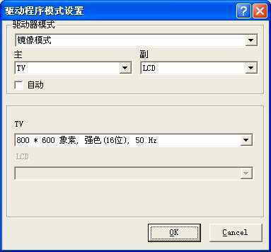调节显卡的控制台:进入“驱动程式模式设置”,将主显示设置为“TV”。如果想让DV和本本的屏幕同时显示图像,只须将“驱动器模式”设置为“镜像模式”,将主显示设置为“TV”,副显示设置为“LCD” (图2)。最后将TV的分辨率设置成“800×600”便可以了。一切搞定以后,这时系统会跳出一个屏幕显示模式转化的提示,选择YES以后便可以同时在DV和本本上面看见电脑画面。