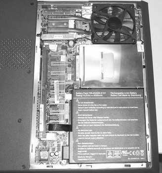天运280E的内存为256MB,硬盘容量为40GB,考虑到一些用户的特殊需求,它还为用户提供了方便的升级特性。不要以为笔记本电脑升级是很困难的啊,其实,为天运280E升级相当简单,把底部左边的三颗螺钉卸下,就可以看到天运280E的部分内部结构了(图3)。电池在不用时可以轻易取下,也可以在空的内存插槽上添加台式机用的DDR内存,还可以更换更大容量的笔记本电脑硬盘,在风扇出问题时也很容易更换。在这里,你可以看到CPU上面的散热片和热管,上面的螺钉比较多,不容易拆卸,没事可别拆。神舟不建议你升级CPU,毕竟2.8GHz的主频已经够高了。天运280E的显卡位于本本的右部,由于不建议用户升级显卡,所以笔记本电脑右边的底部外壳很难拆卸,大家最好不要强拆,ABS塑料的薄脆性决定了它很容易被掰坏的。