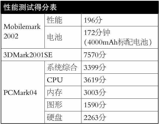 在用3DMark2001SE测试时,得分达到7750分,远比采用Intel Extreme Graphics集成显卡的笔记本电脑得分高多了,这主要得益于它采用的配件性能强大。天运280E的综合性能也很不错,在PCMark04的测试中,CPU、内存硬盘的得分在2300分以上,图形得分达到了1590分,整体性能均衡,显卡成绩很不错。