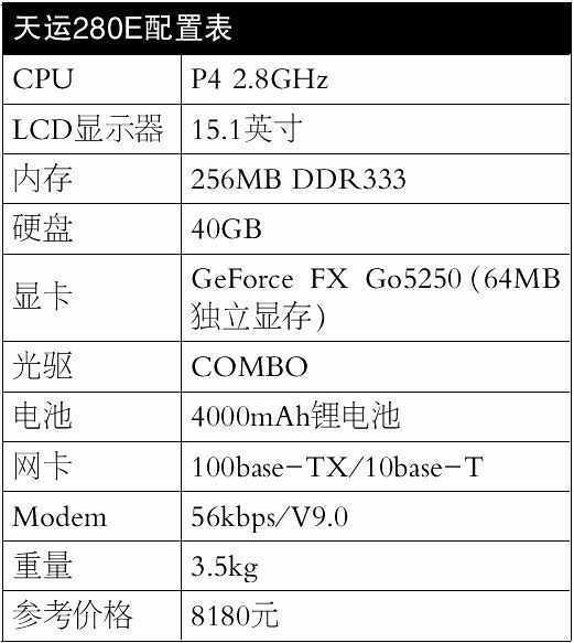 天运280E虽然采用了台式机CPU,但凭借良好的散热系统,劣势转化成优势,台式机CPU提供了强劲的性能,加上宽大的屏幕、出色的显卡性能和4000mAh的锂电池,天运280E的性能丝毫不逊色于任何一款主流的笔记本电脑。虽然其重量达到了3.5kg,也不具备MINI PCI插槽,但8180元的价格,你还能说什么呢。天运280E适合移动使用不多的大学生朋友和家庭用户。