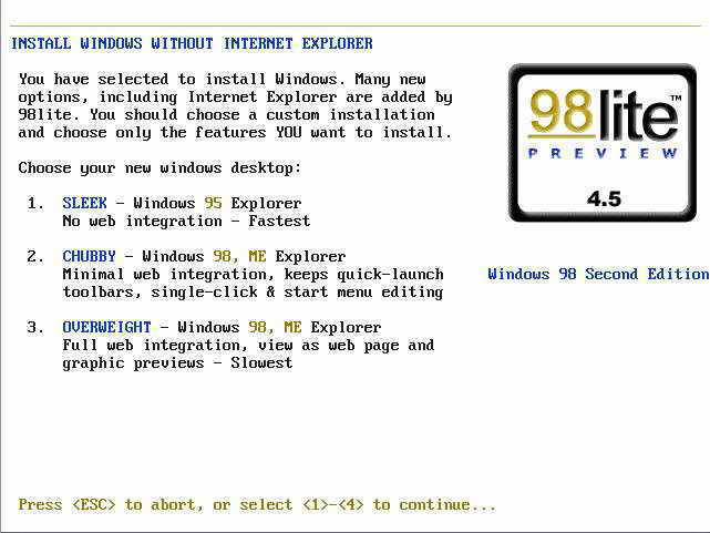 选择后又会出现3个选项:“1.SLEEK”(最小安装,使用Windows 95的外壳,没有集成IE),“2.CHUBBY”(中等安装,最小化的IE集成,保留了快速启动工具条、可编辑开始菜单、鼠标单击启动等功能),“3.OVERWEIGHT”(完全的IE集成,和正常Windows 98安装区别不大,只是对IE之外的一些捆绑软件有更多的选择机会)(图3)。