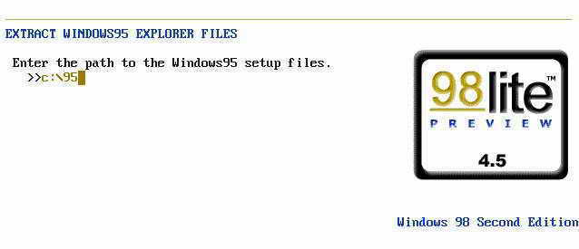 1.先将98lite和Windows 95的文件备份到D分区。用Windows 98启动盘启动后,首先格式化C分区,然后将备份的98lite拷贝到C盘。在C盘根目录建立目录95,将Windows 95的上述5个文件拷贝进去。然后回到根目录,运行98lite45.exe。