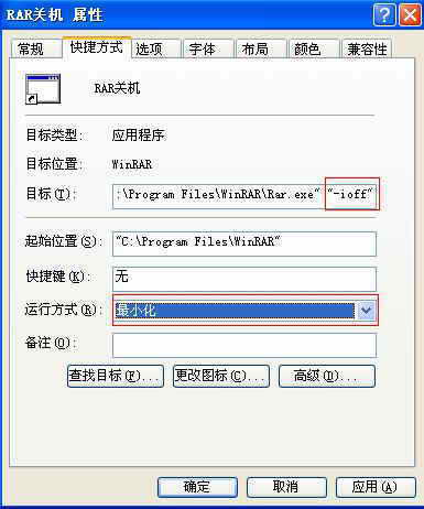 第二步:使用鼠标右击这个快捷方式,选择“属性”命令,在“快捷方式”选项中的“应用程序”下,在目标文本“c:\program files\WinRAR\Rar.exe”后面增加一个“-ioff”参数(图1),注意输入参数时要先按一个空格,并将“运行方式”窗口选为“最小化”,单击“确定”按钮即可。