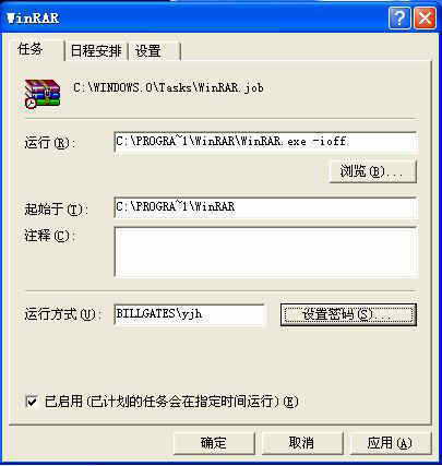 小提示:除此之外,还可以利用“任务计划”来实现定时关机。首先我们可以在“任务计划”中建立一个新任务,一步步单击任务计划向导,在单击“要在Windows上运行的程序”时,选择为WinRAR程序。接着选择任务运行的时间和日期,如“在每个月最后一个星期日的8:10执行这个程序”,接着我们可以输入用户名和密码(如果每次运行时不输入用户名和密码是不能运行的)。最后,我们进入该任务的“高级属性”对话框,在“运行”文本框一栏中输入“c:\program files\WinRAR\Rar.exe”中加入“-ioff”(图2),记得一定要用空格将参数隔开。
