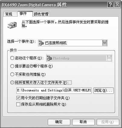 先用鼠标右键单击这个图标调出属性对话框。并选择事件小标签进入设置页(图2)可以看到WinXP系统给相机照片操作输入设定了很多操作方式,这时我们选择第四个选项就可以开启照片自动提取功能,并在下面的文字框中选择照片存放的目录。另两个复选框分别为按时间建立目录或拷贝后删除相机内照片,一般来说建议开启第一项,这样便于管理和识别,第二个选择项根据自己的需要进行设定,最后按一下确定便完成设定。