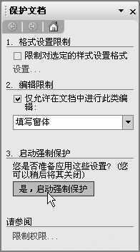 ①单击“工具→保护文档”,在“保护文档”任务窗格中,选中“编辑限制”下的“仅允许在文档中进行此类编辑”复选框,然后在下面的框中选择“填写窗体”并单击“是,启动强制保护”按钮(图4)。