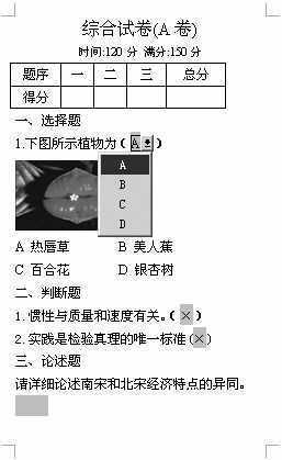 在备考的过程中,最先摆在教师们面前的就是试卷问题。不过,怎样出一份覆盖知识面广、难易适度、能拉开考生层次的好试卷不是本文要讨论的问题。现在很多学校都在试行网上答题,这就需要教师准备电子试卷。本文的目的就是教大家用Word制作一份电子试卷。