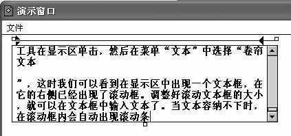 这时,我们可以看到在显示区中出现一个文本框,在它的右侧已经出现了滚动框,调整好文本框的大小,就可以在文本框中输入文本了。当文本框容纳不下文本时,在滚动框内会自动出现滚动条(图1)。