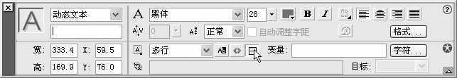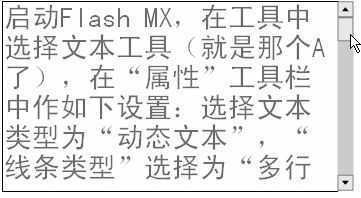 1.启动Flash MX,在工具栏中选择文本工具,在“属性”工具栏中作如下设置:“文本类型”设为“动态文本”,“线条类型”设为“多行”(即允许在文本框中显示多行文本),按下右侧的“在文本周围显示边框”按钮,设置好字体、大小以及对齐方式等,如图3所示。